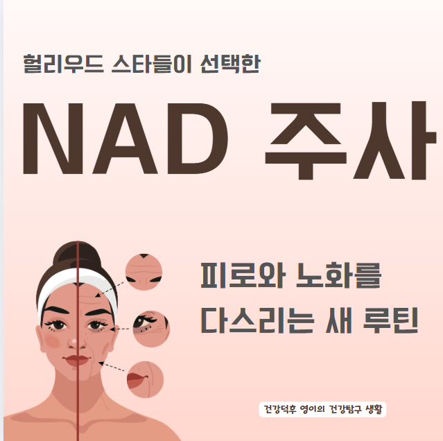 헐리우드 스타들이 사랑하는 NAD 주사! 항노화, 피로회복, 두뇌 활성화까지. 성분, 효과, 부작용, 비용, 안전성, 한국 병원 현황까지 한눈에 정리했습니다.🧬 NAD 주사란?NAD는 ‘니코틴아마이드 아데닌 다이뉴클레오타이드(Nicotinamide Adenine Dinucleotide)’의 약자예요.우리 몸의 모든 세포 안에서 에너지 생성과 세포 회복에 핵심 역할을 하는 조효소로,쉽게 말하면 세포의 젊음을 유지해주는 원동력이에요 💡하지만 나이가 들수록 이 NAD 수치는 급격히 떨어져요.그래서 피로, 기억력 저하, 노화, 면역력 약화 등이 함께 나타나죠.헐리우드에서는 이런 현상을 막기 위해 정맥으로 직접 NAD를 주입하는 주사요법이 붐처럼 번졌어요. 출처: Harvard Medical School 연구..
