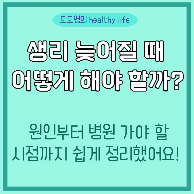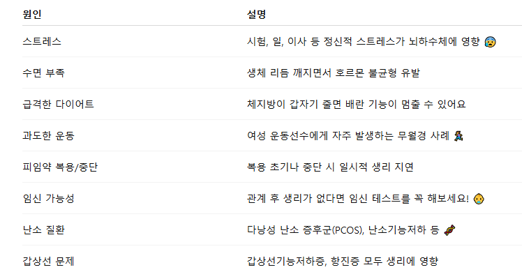 이 외에도 수유 중, 폐경 전후, 약물 복용 등도 생리를 늦게 만들 수 있어요.