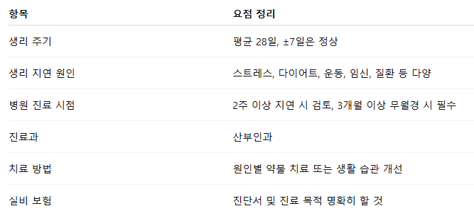 생리가 늦어질 때 불안하셨나요? 생리 주기 계산법부터 지연 원인, 병원 진료 필요 시기, 치료 방법까지 2025년 기준 최신 정보를 정리했습니다.