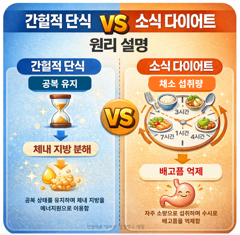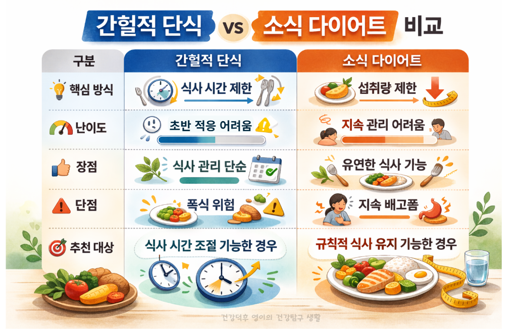 간헐적 단식 vs 소식 다이어트 차이를 2026년 기준으로 비교하고, 체중관리와 건강에 맞는 선택 기준과 주의사항까지 실제 적용 가능한 방법 중심으로 안내합니다.