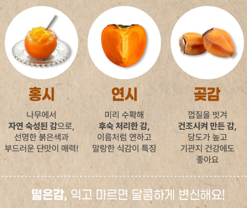 - 특징: 떫은감이지만 숙성되면 꿀처럼 달아요.