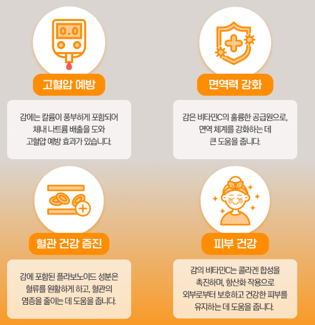 - 항산화 효과: 감에는 베타-카로틴, 루테인, 제아잔틴 등의 카로티노이드와 폴리페놀, 타닌 등 항산화 물질이 풍부해요.