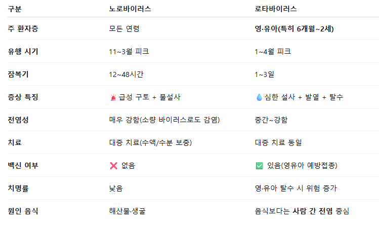 📊 노로바이러스 vs 로타바이러스 비교표