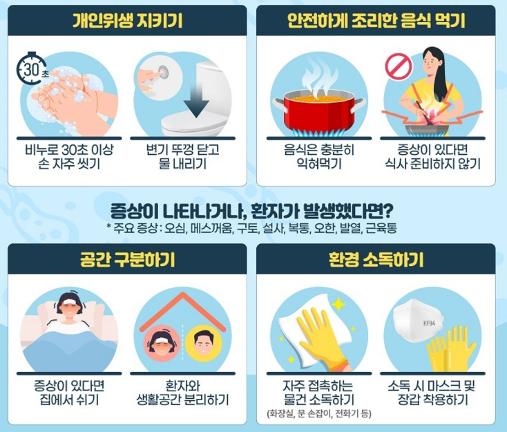- 감염자는 증상이 사라진 후 2~3일은 음식 조리 금지