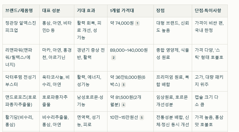 - 장점: 임상 원료 사용, 테스토스테론(남성호르몬) 증가 효과 기대.