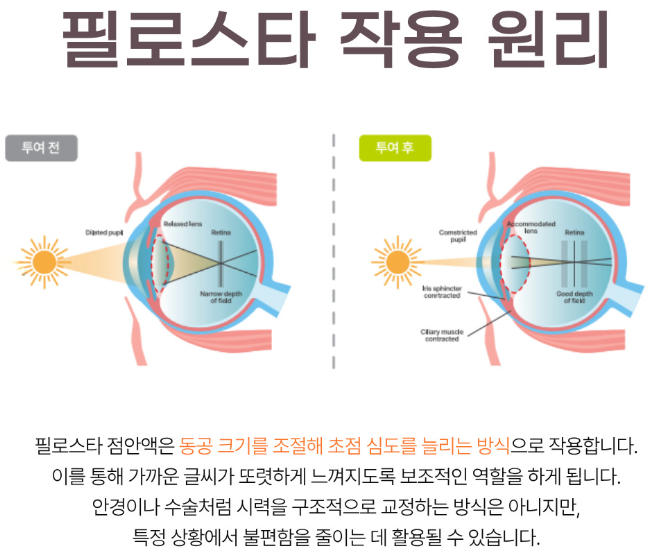- 필로스타 1% (녹내장 적응증, 오프라벨 노안 처방 활발)