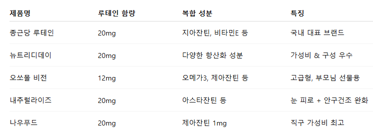 - 루테인 + 아스타잔틴 + 오메가3 + 비타민A, D 등 복합 구성