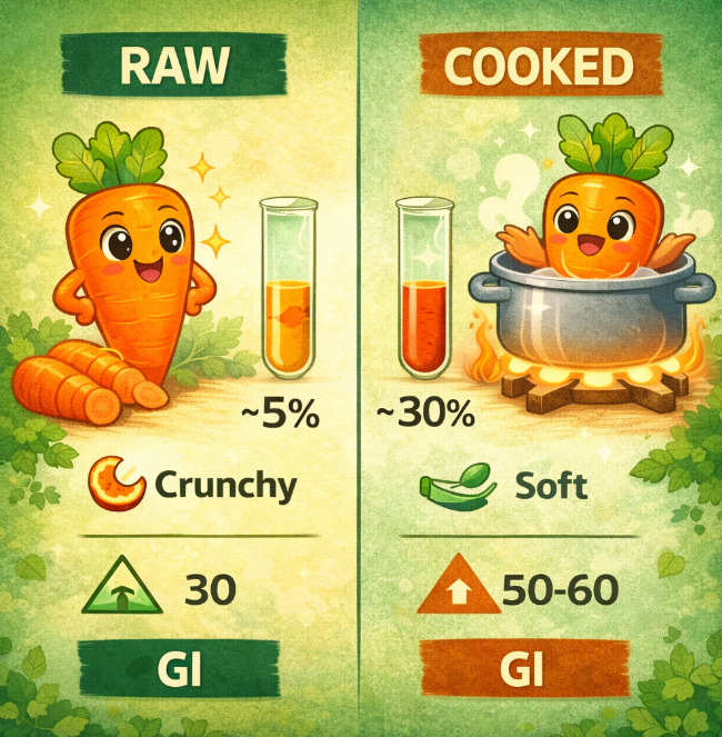✔ 당뇨가 있는 경우 → 조리된 당근은 혈당 올릴 수 있음