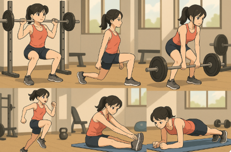 - 근력 운동: 스쿼트, 런지, 데드리프트 등 복합 운동