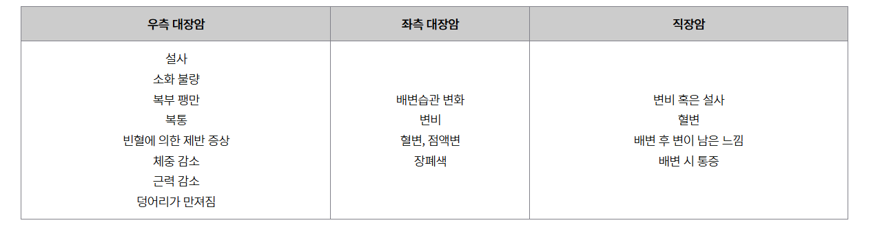 대장암의 초기 증상은 뚜렷하지 않아 단순한 소화불량이나 치질로 오인하기 쉽습니다. 그래서 정기검진이 꼭 필요합니다.
