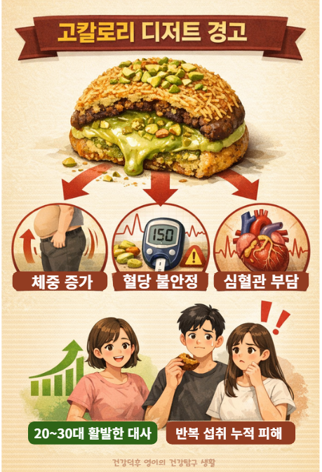 이런 작용 원리로 인해 두쫀쿠는 단순한 디저트가 아니라, 대사 균형을 무너뜨리는 습관성 식품이 될 수 있어요.