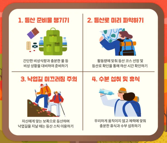 - 식사/수분: 등산 전 과식은 피하고, 수분은 30분 간격으로 조금씩 섭취