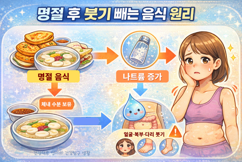명절 후 붓기 빼는 음식을 찾는 이유는 단순 체중 증가 때문이 아닙니다. 대부분은 나트륨 과다 섭취와 수분 저류 때문입니다. 특히 명절 음식은 국물, 전, 가공식품 위주라 나트륨 배출 음식과 붓기 제거 식단이 핵심이 됩니다.