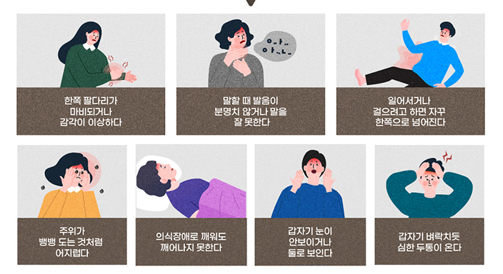 - 초기 증상: 팔다리 힘 빠짐, 언어장애, 시야장애, 두통, 경련 등