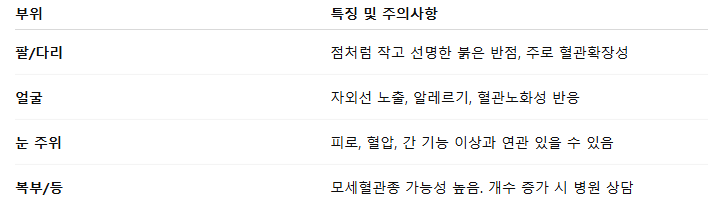 - 특히 얼굴, 눈 주변, 입가에 자주 생기며, 작고 붉은 혈점처럼 보여요.