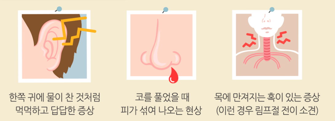 - 🚨 경고 증상 지속 시: 코막힘, 귀 먹먹함, 목 덩어리 2주 이상 → 이비인후과 방문