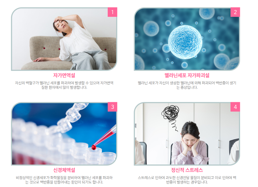 심리적 스트레스나 피부 손상(화상, 상처 등)이 백반증을 유발할 수 있어요. - 화학물질 접촉