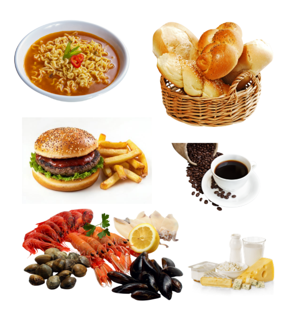 - 글루텐 함유 식품: 밀, 보리, 라면, 빵 등