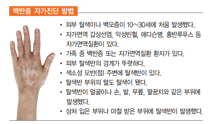 백반증은 멜라닌 색소세포가 파괴되어 생기는 자가면역성 피부 질환입니다.