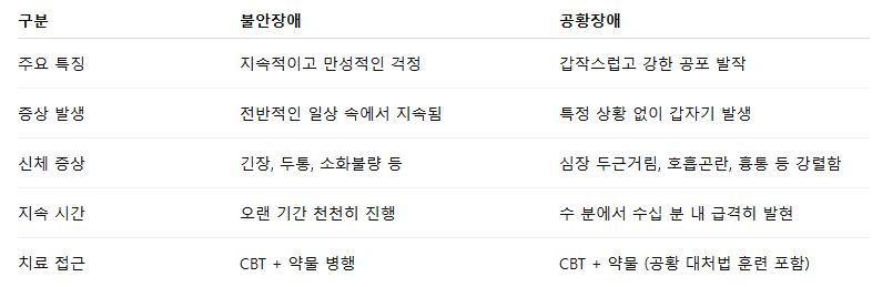 💡 공황장애는 불안장애의 한 유형이 아니며, 별도로 진단되는 독립 질환입니다.