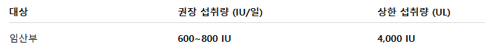 - 임산부 권장량은 600~800 IU/일,