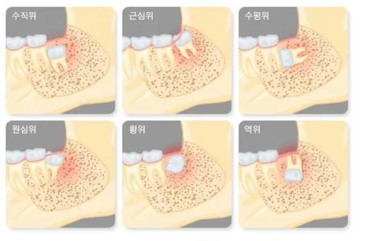 - 매복: 잇몸 속이나 턱뼈 안에 갇혀 나오지 못함