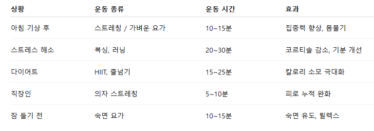 이 글은 아침, 스트레스, 다이어트, 직장인 상황별로 정확히 어떤 운동이 최적인지, 실제 루틴까지 포함해 100% 검색자 의도를 해결합니다.
