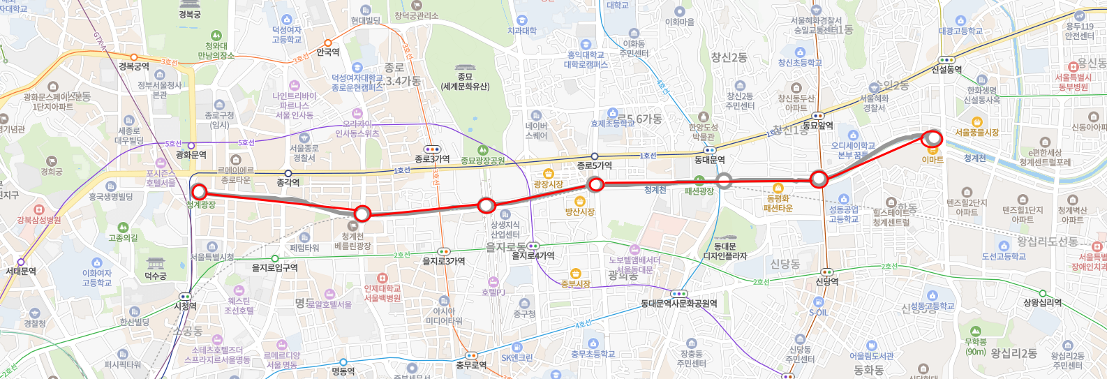 - 주요 구간: 광화문 → 청계광장 → 세운상가 → 동대문디자인플라자(DDP)