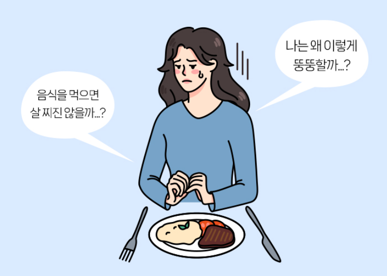 - 체중 관련: 급격한 체중 변화, ‘살찌는 것에 대한 공포’, 거울 속 자신을 뚱뚱하게 인식