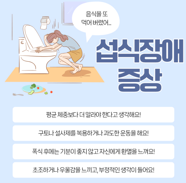 음식과 체중, 체형에 대한 비정상적인 집착으로 인해 정신적·신체적 건강을 모두 해치는 정신 건강 질환이에요.