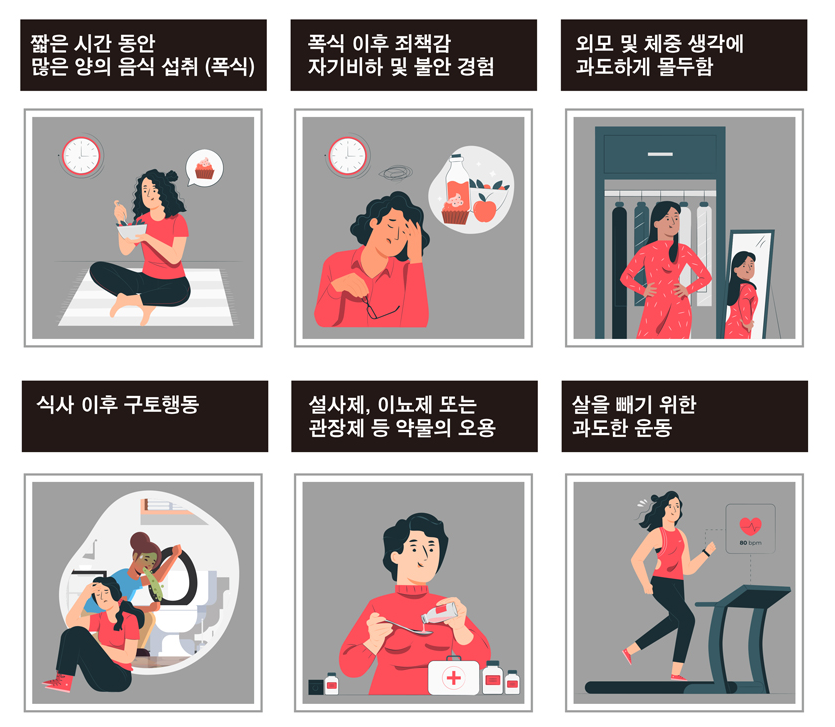 - 음식 섭취: 의도적 절식, 폭식 후 구토·이뇨제 사용, 음식 칼로리 집착