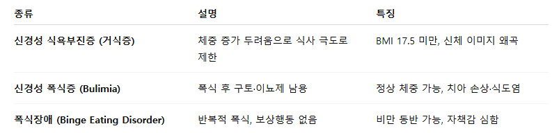 - 사회·환경적 요인: 마른 몸매 중심의 미디어 문화, 다이어트 압박