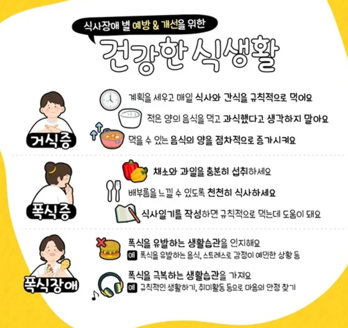음식과 체중, 체형에 대한 비정상적인 집착으로 인해 정신적·신체적 건강을 모두 해치는 정신 건강 질환이에요.