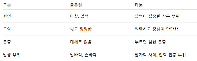 👉 대한피부과학회에서는 굳은살과 티눈을 같은 범주의 ‘과각화증’으로 보지만, 통증과 치료 접근이 다르다고 설명합니다【대한피부과학회 자료】.