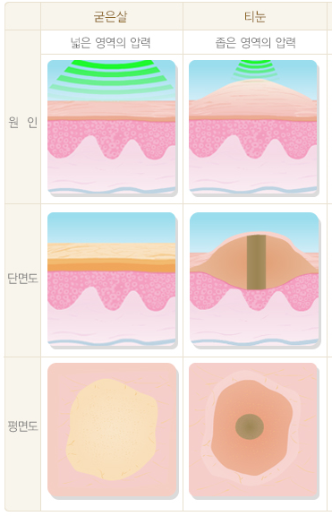 - 원인: 체중 압력, 건조한 피부.