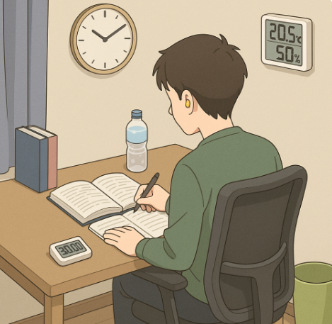 - 책상 위 5품목 룰: 문제집·오답노트·펜·물·타이머만.