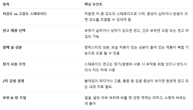 스키터 증후군처럼 알레르기 반응이 심한 경우, 외용제를 고를 때 & 사용할 때 다음 점들을 꼭 고려해야 해: