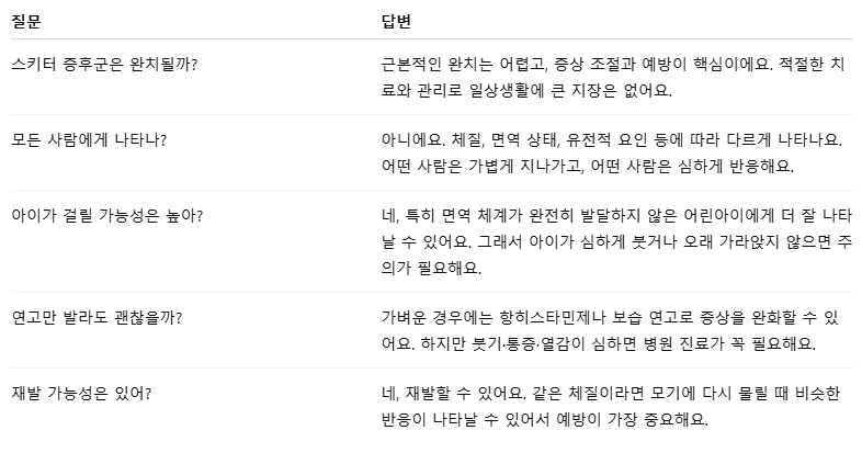 포인트: 감염성 질환은 항생제 처방이 중요하지만, 스키터 증후군은 알레르기 반응이므로 치료 방식이 달라져. 잘못된 처치가 오히려 악화할 수 있음.