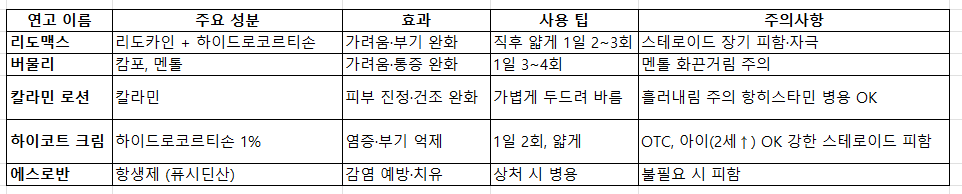 스키터 증후군 치료의 핵심은 가려움과 염증 완화입니다. 대부분 OTC(일반의약품) 연고로 충분하지만, 증상이 심하면 피부과에서 처방 연고를 받는 게 좋습니다. 아래는 한국 약국에서 쉽게 구입할 수 있는 추천 연고입니다. (사용 전 약사나 의사 상담 필수, 특히 아이나 임산부는 주의)