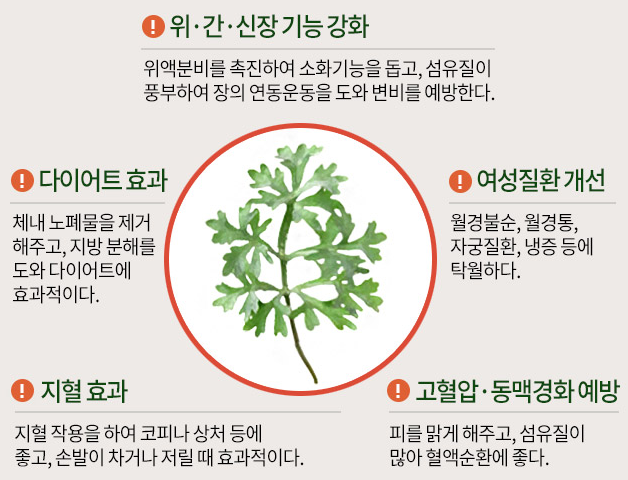 예로부터 한방에서 냉증, 생리통, 해독작용 등에 널리 쓰인 쑥은, 요즘에는 쑥차, 쑥좌훈, 쑥환, 쑥가루 등 다양한 형태로 가공되어 현대인의 건강식품으로 각광받고 있죠.