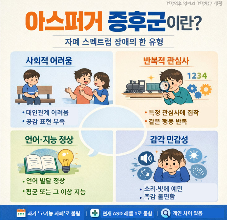 ※ 2026년 기준, 의료 현장에서는 “아스퍼거” 대신 ASD 레벨 1이라는 표현이 사용되는 경우가 많습니다.