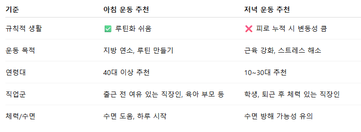 - 추천 시간대: 아침 운동 선호 시 루틴화 / 저녁 운동은 피로 누적 고려해 선택