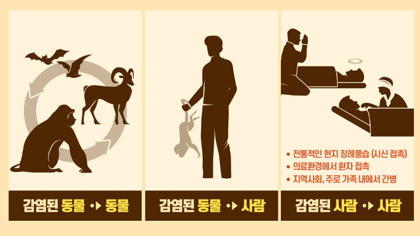사람과 원숭이 같은 유인원에게 감염될 수 있고, 고열·구토·출혈 같은 증상을 동반하죠.