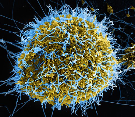 <파란색 에볼라 바이러스가 노란색 숙주 세포를 감염시키고 있는 모습>