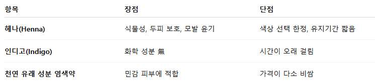 요즘은 "무해염색약", "천연유래 성분", "저자극 인증" 제품이 다양하게 출시되고 있어요.