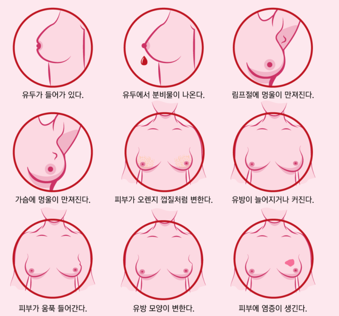 • 피부 변화, 유두 함몰 등 외관상 변화