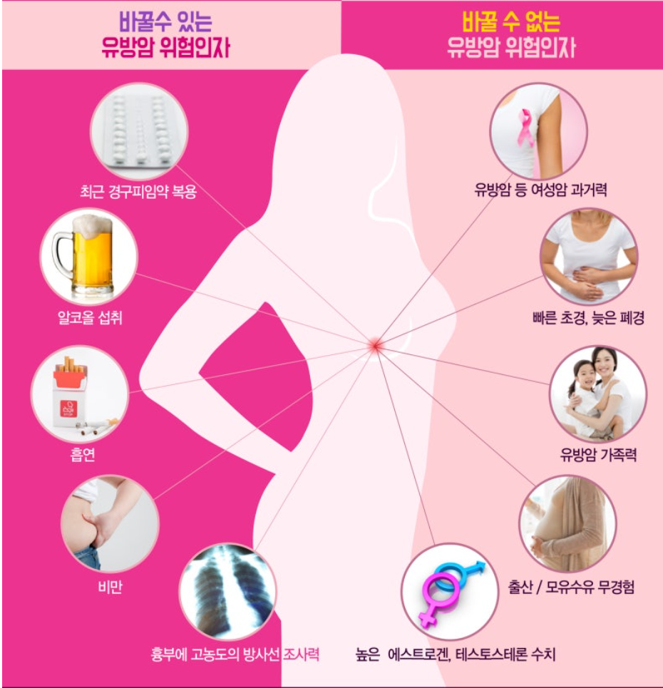 • 호르몬 요인: 에스트로겐 노출 기간이 길수록 위험 증가