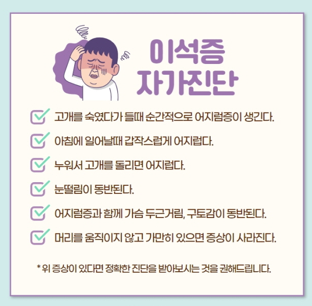 - 이석증은 진단이 비교적 명확하고 치료 반응이 좋은 어지럼증입니다.