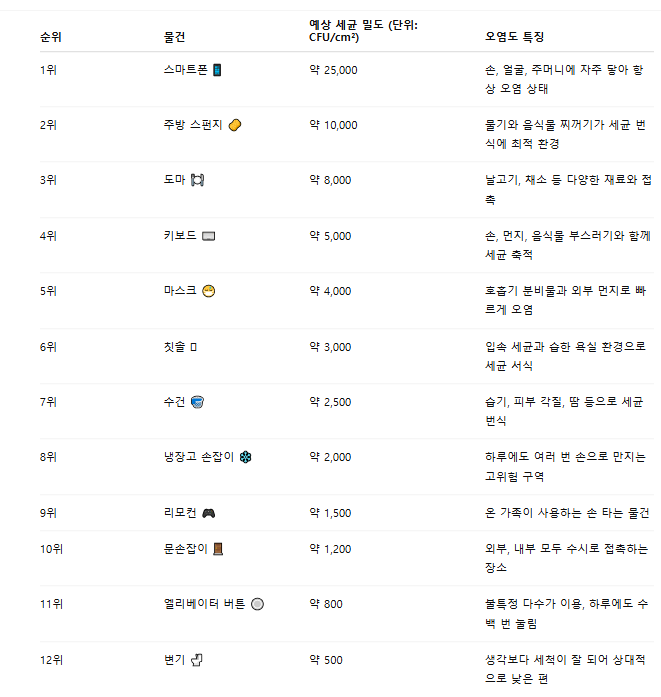 (참고: 세균 밀도는 최근 연구 및 위생 조사 통계 기반으로 2024년 업데이트된 수치입니다.)
