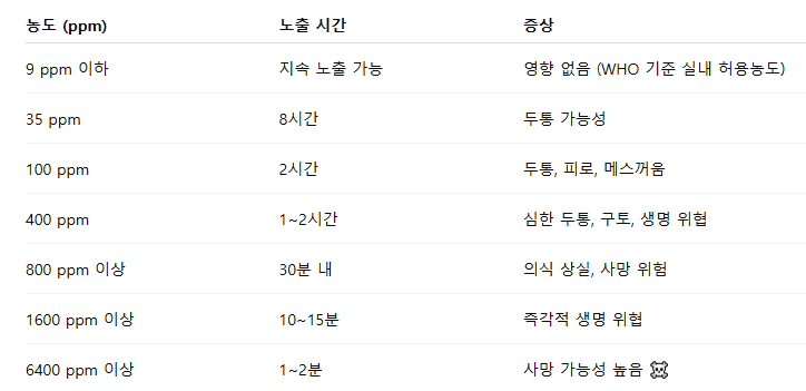- 🔥 보일러/난로: 불완전 연소 시 일산화탄소 발생